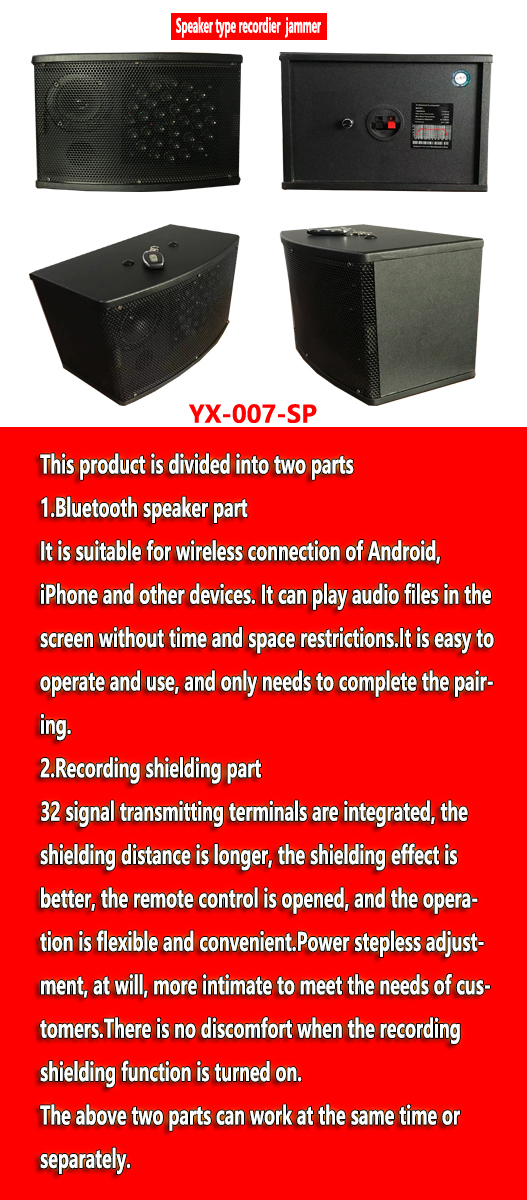 This kind of recording shield is a newly developed Bluetooth audio version concealed recording shield developed by our company, which has dual functions of recording shield and Bluetooth speaker.In view of the reason that some noise will be produced during the operation of the recording screen, our company specially launched this product and recommended background music (optional by users) at the factory, so that some sound produced during the operation of the recording screen can be skillfully integrated with the background music, making the two mutually beneficial.The purpose of shielding illegal recording is realized by the concealment of speaker.