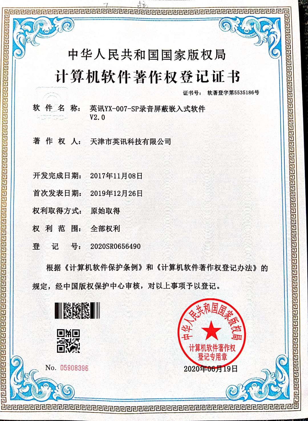 公司YX-007-XD吸顶式录音屏蔽器产品获得计算机软件著作权登记证书!!!