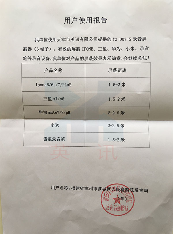 近日福建省漳州市芗城区人民检察院采购我司数台YX-007录音屏蔽器,包括手持型和桌面型用于本单位的检察系统,保证信息安全防止被非法泄密,产品受到领导的高度好评,有效的保证信息的安全为检察系统的正常工作保驾护航!