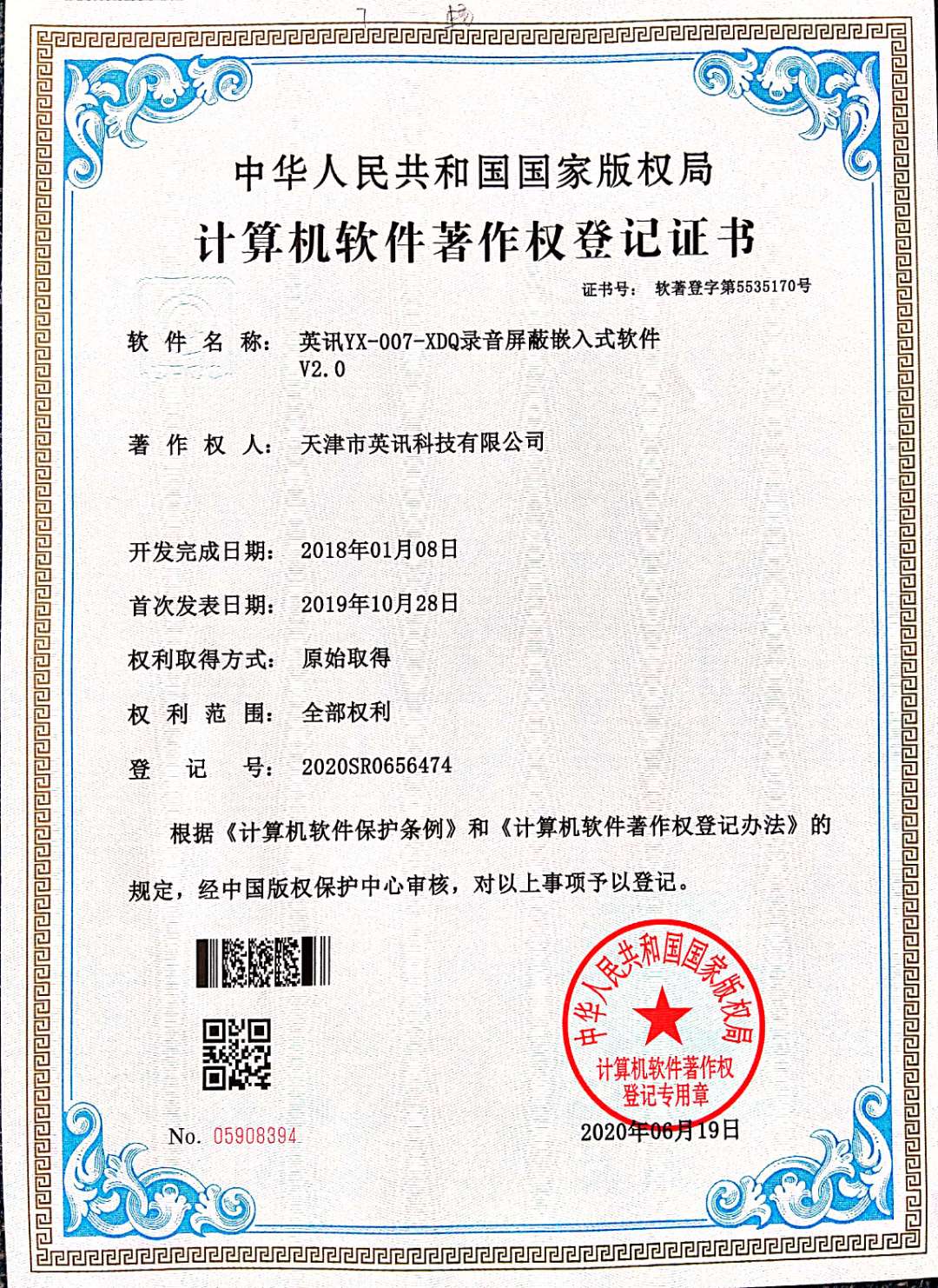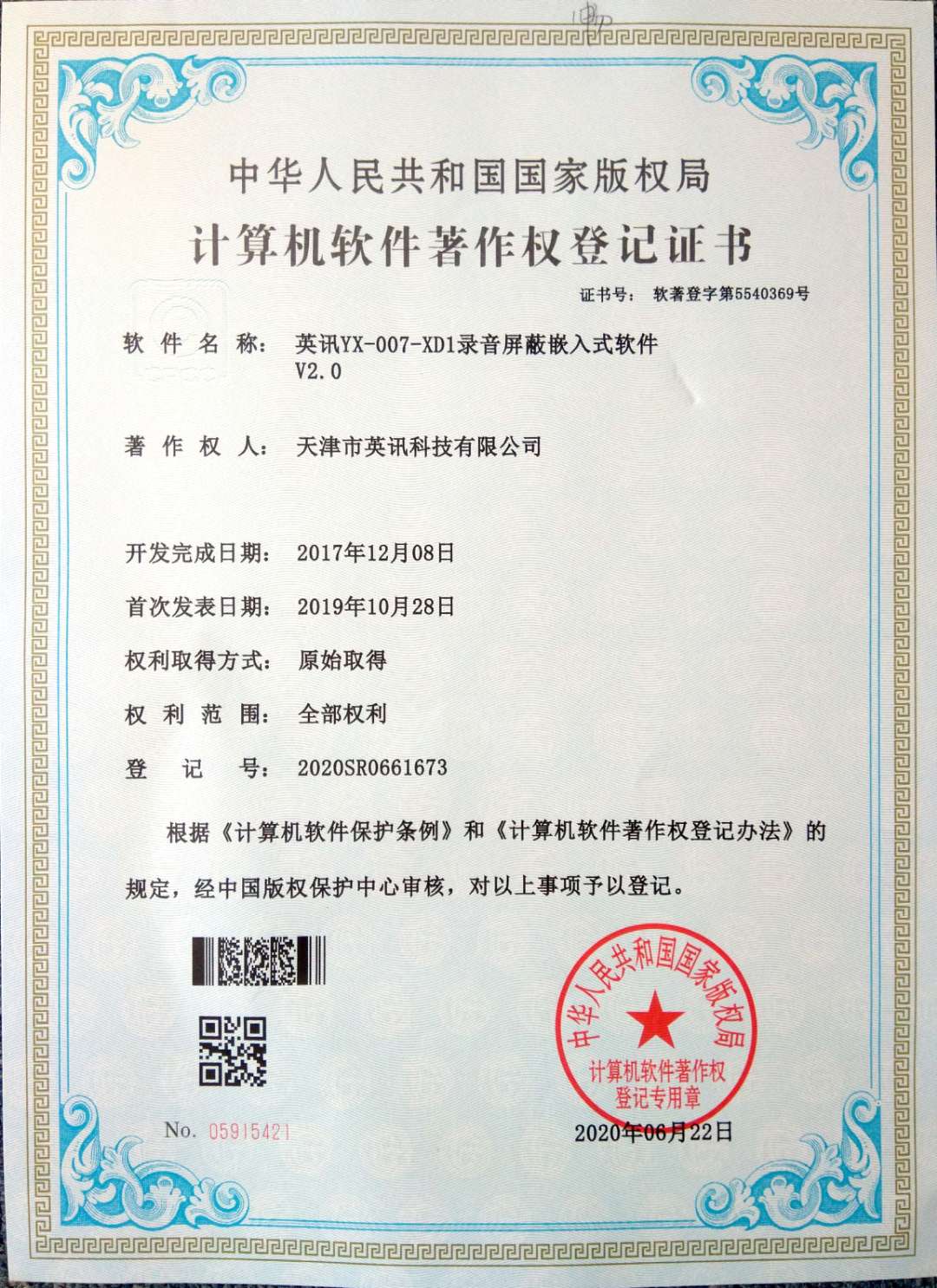 公司YX-007-XD吸顶式录音屏蔽器产品获得计算机软件著作权登记证书!!!