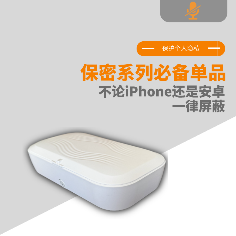 防护盒内置语音信息屏蔽模组:在盒内形成屏蔽场。手机不使用时,将其放在盒内即可有效杜绝语音泄密,同时也不影响手机信息的正常接收。