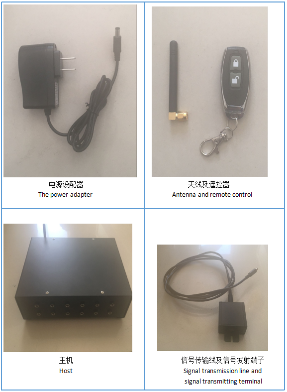 After receiving this product, user needs to check one host equipment、one power adapter、12 signal transmitting modules 、Signal transmission line 12 、A remote controller and one Antenna in the packing case.